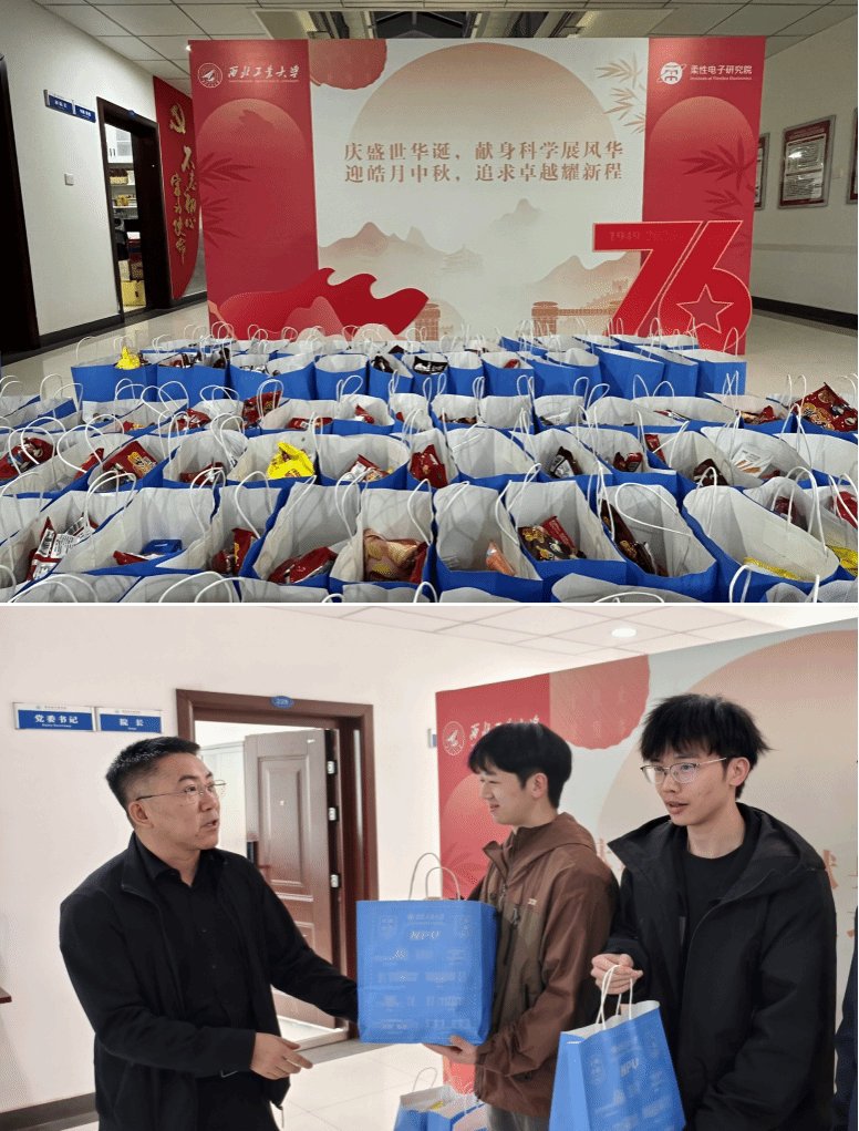 9月30日,在国庆和中秋假期来临之际,柔性电子研究院通过集中为同学们发放“中秋暖心大礼包”、走访学生宿舍等形式,为全院本硕博近800名学生送来节日的问候和“平安过假期”的提醒。