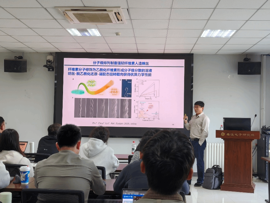 在本次学术报告中,主讲人围绕高性能纤维材料、仿生结构以及新型制备方法等前沿方向进行了系统而生动的讲解。报告从天然蜘蛛丝卓越的力学性能出发,深入分析了其高强度、高韧性与多级结构之间的关联,引导听众理解生物体系中扭转取向与纤维性能提升之间的内在机制。随后,主讲人展示了团队在仿生纤维制备方面取得的多项进展,包括多尺度结构设计、分子取向调控、纳米纤维构筑等方法,以及这些仿生纤维在力学、热学和电学方面展现出的独特优势。通过大量实验数据和对比分析,系统呈现了仿生螺旋结构、周期性几何构型等自然界启发式设计在材料功能提升中的显著作用。在报告的中后部分,主讲人进一步拓展到纤维材料在工程实际中的应用前景,如制冷材料、节能技术等方向,深入探讨了相关领域面临的技术挑战与未来发展路径。同时,他还回顾了团队近年来的重要研究成果与代表性论文,展示了系统性的研究布局与持续创新的科研思路。整场报告内容充实、层次分明,既有前沿进展,也有深度思考。在场师生在轻松而富有启发性的讲解中拓宽了学术视野,对材料科学中仿生设计与结构调控的重要性有了更加深刻的认识。