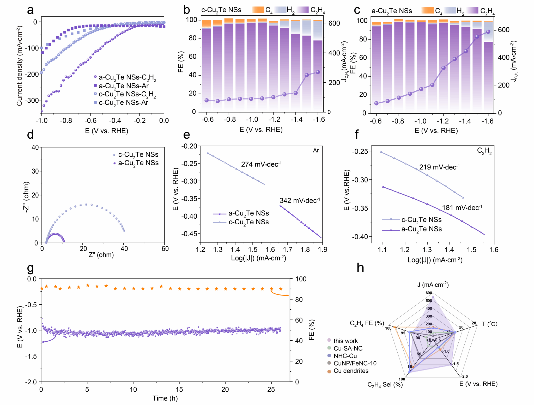 图2. 晶形Cu2Te NSs与非晶Cu2Te NSs的电催化乙炔半加氢性能表征