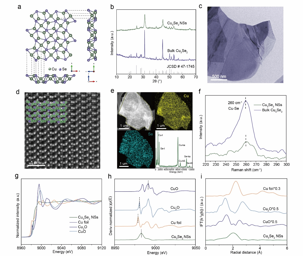 针对这一核心难题,西北工业大学黄维院士团队荣子强教授、方漪芸副教授与材料学院张健教授、西安交通大学李鑫哲研究员合作在Angewandte Chemie International Edition期刊发表题为“Dual Spatial and Electronic Regulation in van der Waals Cu3Se2 Nanosheets for Electrocatalytic Acetylene Semi-Hydrogenation”的研究论文。该研究通过精确构筑二维范德华Cu3Se2纳米片,实现了Cu–Se共价框架在层状晶格中的有序嵌套。这一独特结构同时解决了铜基催化剂的几何与电子困境:(1)在空间维度上,打破了Cu–Cu连续性,有效抑制C–C偶联反应;(2)在电子维度上,Cu 3d–Se 4p轨道杂化实现了温和的电子结构调控,既避免了高电负性载体的依赖,又降低了析氢竞争。