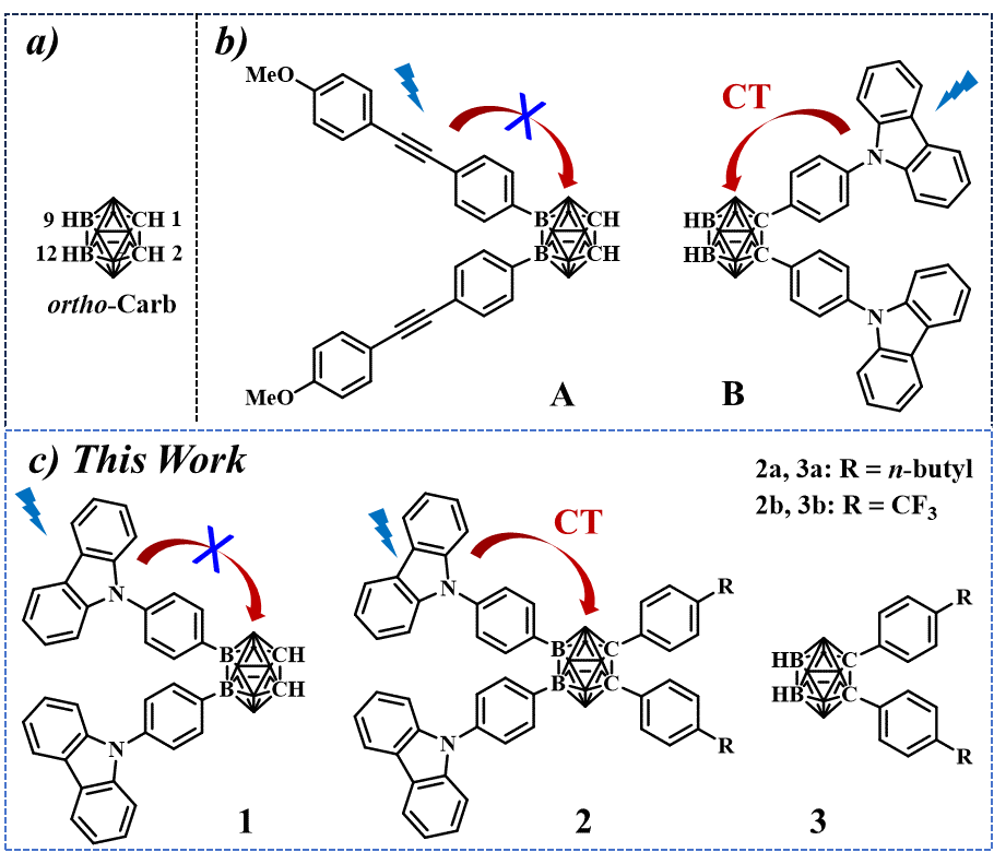 有机电子材料多以有机芳香化合物为核心,因其π共轭体系可实现较大的轨道重叠,从而显著增强电子跃迁强度。碳硼烷是一个由碳、氢、硼组成的具有三维芳香结构的12顶点笼状分子,其表面p轨道与有机取代基的轨道重叠较小,因此很少被用于构建发光材料。2007年,Chujo及其同事报道了碳位取代邻碳硼烷表现出强烈的电荷转移(CT)发射,自那时起,大量具有优异发光性能的碳位取代邻碳硼烷被相继报道,并被应用于有机发光二极管(OLED)、圆偏振发光(CPL)以及荧光传感等领域。Chujo及其同事曾报道若干硼位取代邻碳硼烷(无论碳原子上是否带有取代基),但在其吸收光谱或发射光谱中均证明硼取代基与碳硼烷笼之间没有相互作用。