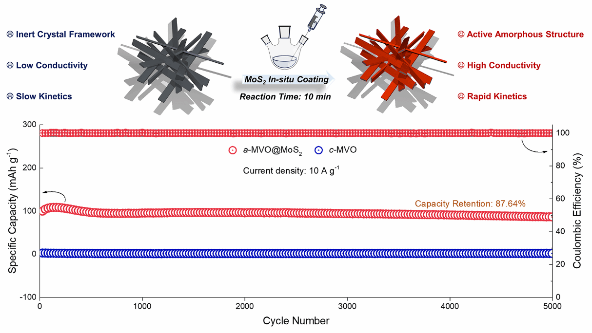 水系锌离子电池(AZIBs)因其安全性高、成本低廉和环境友好等特点,在大规模储能领域具有广阔前景。然而,其正极材料常面临结构退化快、离子扩散动力学缓慢等问题,制约了电池的实际应用。近年来,非晶材料因其结构柔性和丰富的活性位点备受关注,但其本征导电性差、循环稳定性不足等问题仍未得到根本解决。因此,如何协同调控材料结构与界面性质,实现高容量、高倍率与长循环的兼顾,成为该领域的研究难点与热点。